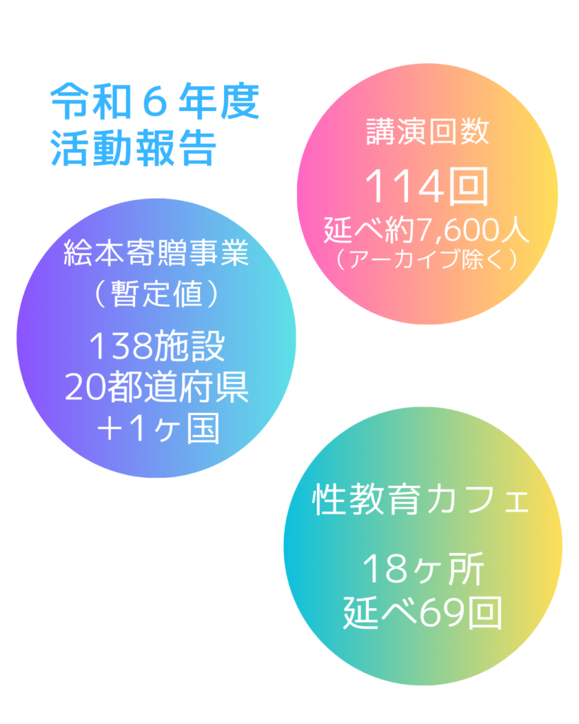 当法人代表の著書「げっけいのはなし いのちのはなし」を施設等へ寄贈することにより、小さい頃からの性教育の大切さや生き方の多様性を広める活動をしています。